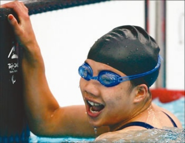| 右图 9月13日,中国选手夏江波在S3级女子50米自由泳预赛中以1分05秒83的成绩进入决赛。当日,在国家游泳中心“水立方”进行的北京2008年残奥会游泳比赛进入第七天。