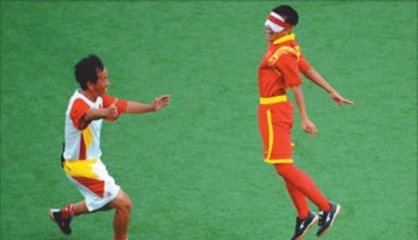 | 9月13日,中国队球员郑文发(右)进球后与教练一起庆祝。当日,在北京2008年残奥会五人制(盲人)足球小组赛中,中国队以1比0战胜西班牙队。