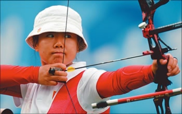 | 9月13日,中国选手高芳霞在比赛中。当日,在北京残奥会女子个人反曲弓————站姿决赛中,高芳霞以92比103环的成绩负于韩国选手李花淑,获得银牌。 新华社记者 索朗罗布摄 |