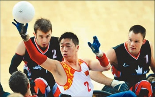 | 9月13日,中国队球员陈君(左)与加拿大队球员伊恩·尚在比赛中拼抢。当日,在北京2008年残奥会轮椅橄榄球预赛中,中国队以25比57负于加拿大队。 新华社记者 王小川摄 |
