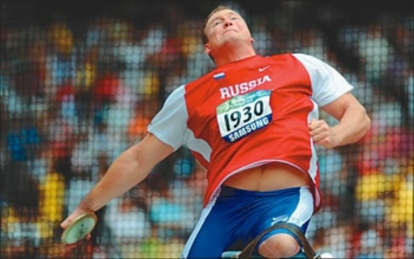 | 9月13日,俄罗斯选手阿沙帕托夫在比赛中。当日,在国家体育场进行的北京2008年残奥会男子铁饼F57/58级决赛中,阿沙帕托夫以57米61的成绩夺冠并打破世界纪录。