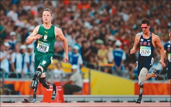 | 9月13日,有“刀锋战士”之称的南非名将皮斯托瑞斯(左)在比赛中。当日,在国家体育场进行的北京2008年残奥会男子200米T44级决赛中,皮斯托瑞斯以21秒67的成绩夺冠,这是他在本届残奥会上获得的第二枚金牌。