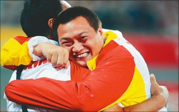 | 9月13日,中国选手夏东(右)夺冠后与教练拥抱庆祝。当日,在国家体育场进行的北京2008年残奥会男子铅球F37/38级决赛中,夏东以16米60的成绩夺冠,并打破世界纪录。