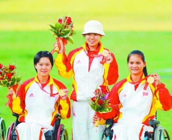 9月15日,中国选手高芳霞(中)、萧彦红(左)、符洪芝在颁奖仪式上向观众挥手致意。当天,北京2008年残奥会女子团体反曲弓公开级比赛中,中国队获得金牌。 本报记者 赵 晶摄