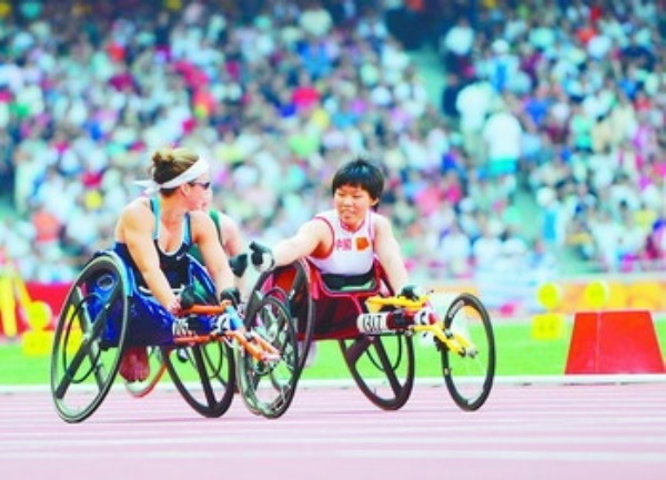 左图 9月15日,在国家体育场进行的北京2008年残奥会女子200米T53级决赛中,中国选手黄丽莎(右)以29秒17的成绩夺得冠军,并打破世界纪录。 本报记者 赵 晶摄