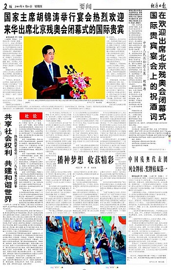 国家主席胡锦涛举行宴会热烈欢迎来华出席北京残奥会闭幕式的国际贵宾
