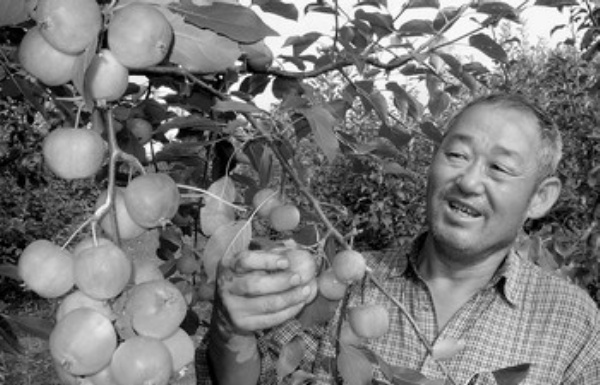 这是黑龙江黑河市林业退休职工林泓日前在自家的果园采摘水果。今年,林泓培育的秋香梨等12个水果品种喜获丰收,从而结束了黑河市受高纬度等自然条件限制,不能种植梨树等果树的历史。 邱齐龙摄(中经网供图)