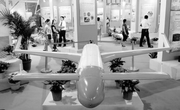 9月23日,软件产品博览会现场展示的一架遥控飞机。 当日,第四届中国(南京)国际软件产品博览会开始接待参观者。本届软博会有20多个国家和地区组团或派代表参加。日前,软博会已达成重要签约项目100多个,总投资额100多亿元。 新华社记者 孙 参摄
