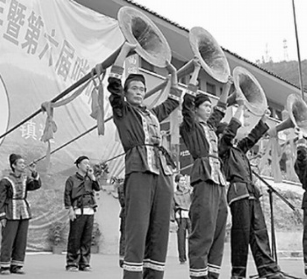 日前,贵州省镇远县尚寨乡举行第六届八月八唢呐节活动,土家族汉子表演大号唢呐吹奏。 吴如雄摄(新华社发)