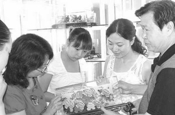 河北衡水是三大内壁绘画技艺的发源地之一。为了将该民间工艺发扬光大并形成产业,当地政府积极扶持民间人士创办企业,形成民间工艺人士与群体企业互动优势,使整个产业销售收入达到了亿元。图为被联合国教科文组织授予“民间工艺美术大师”称号的张汝财(右一)在向客商介绍企业的新产品。 雷汉发 李 丽摄影报道