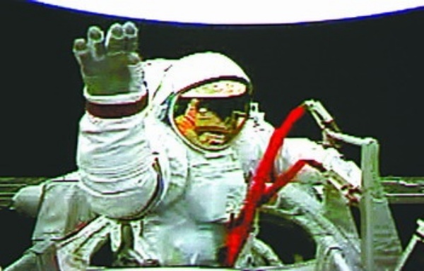 9月27日,执行神舟七号载人航天飞行出舱活动任务的航天员翟志刚出舱后挥手致意(摄于北京航天飞行控制中心大屏幕)。新华社记者 查春明摄