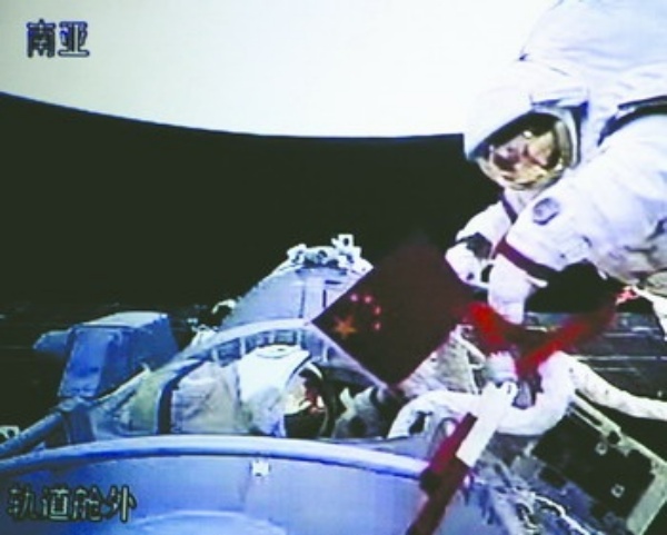 9月27日,航天员刘伯明将中国国旗递给出舱的翟志刚(摄于北京航天飞行控制中心大屏幕)。新华社记者 陈建力摄