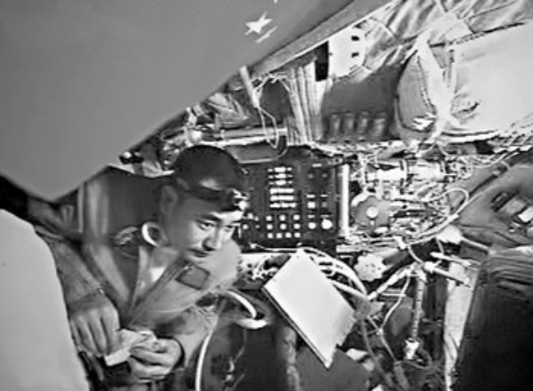 9月26日23时01分,手持食品袋的航天员翟志刚在神舟七号飞船轨道舱内进食(拍摄于北京航天飞行控制中心大屏幕)。 新华社记者 查春明摄