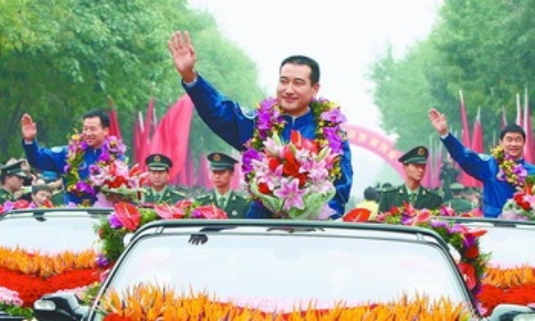 “英雄航天员,祖国和人民为你们骄傲”、“热烈庆祝神舟七号载人航天飞行获得圆满成功”的巨幅标语在空中摇曳,盛装少年与花束、花环掩映形成一道独特的风景,人群簇拥着在翘首期待……三度金秋,三度飞天,三度突破,这一场景让人们觉得似曾相识。