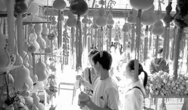 9月29日,游客在贵州青岩古镇上挑选象征吉祥长寿的葫芦。 当日是国庆长假第一天,群众纷纷出游享受休闲时光,络绎不绝的游客来到贵州参观著名的青岩古镇。 新华社记者 秦 晴摄