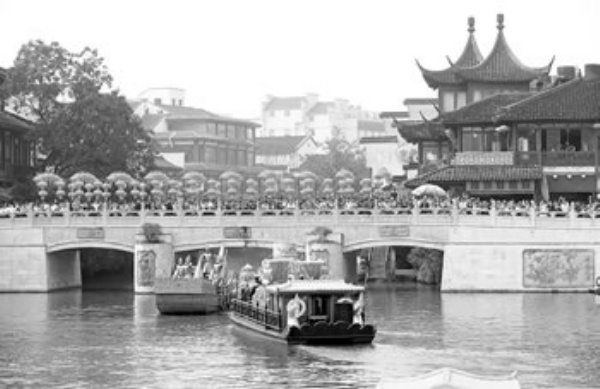 10月1日,游人在南京夫子庙前的秦淮河文德桥上观看水上仿古表演。 当日,南京夫子庙旅游景区张灯结彩,热闹非凡。许多市民和游客前来观光游玩,欢度国庆佳节。 新华社记者 孙 参摄