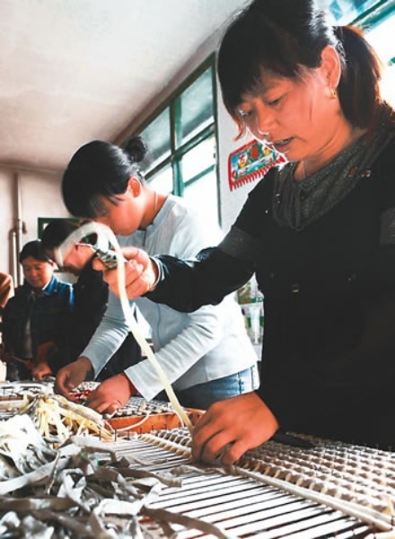 9月17日,几位妇女在编织亚麻汽车座垫。 黑龙江省兰西县红星乡新星村在贫困户劳动力“雨露计划”培训资金支持下,采取引麻编企业到村,编织车间到屯、到户的方式,通过“炕头麻编”促进农民增收。 新华社记者 王建威摄