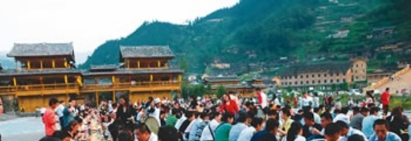 10月2日,游客在西江苗寨吃长桌宴。“十一”长假期间,贵州黔东南苗族侗族自治州雷山县西江千户苗寨成为旅游热点,吸引了众多游客和摄影爱好者。 章 静摄(新华社发)