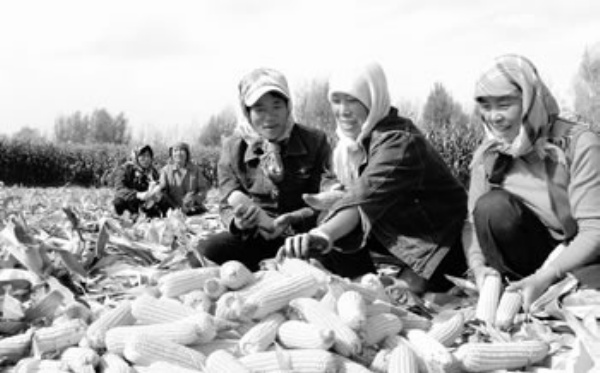 9月18日,甘肃张掖市甘州区上秦镇徐赵寨村农民组成的互助组正在收获制种玉米,今年该区种植的42.8万亩制种玉米、8.5万亩大田玉米喜获丰收。 本报记者 李琛奇 通讯员 朱兴忠摄影报道