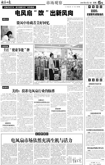 近年来,随着人们对健康环保生活的不断追求,以美的为代表的电风扇企业又重新回归市场。从2003年开始,电风扇行业连续5年产销两旺,2007年电风扇产品的产量超过了1.4亿台。占据国内市场半壁江山的美的风扇更是业绩骄人,2008年1至8月上旬,美的环境电器制造有限公司(以下简称美的环境电器)的风扇国内销售业绩已达1600万台,销售金额达到20亿元,同比增长21%,出口1200万台,销售金额1.35亿美元。