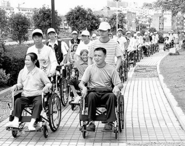 日前,江西省龙南县百名残疾人高兴地坐在新轮椅上欣赏着城市风景。龙南县残疾人联合会等单位为方便残疾人的生活,给该县家庭困难的残疾人免费发放了100辆轮椅。 李慧摄