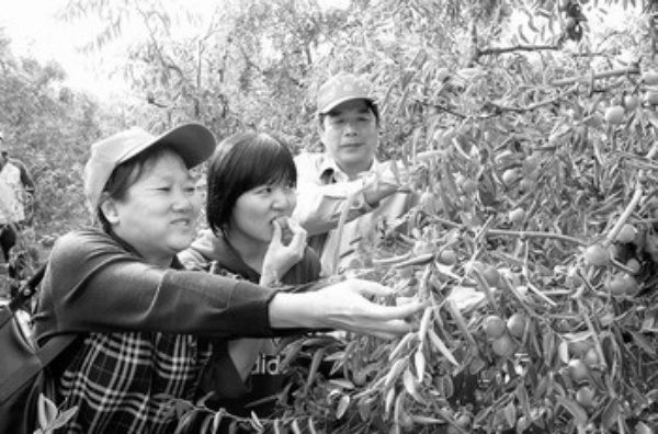 10月3日,游客在山东沾化下洼生态旅游园采摘冬枣。当日,由山东省滨州市委、市政府和山东省旅游局联合主办的中国滨州第10届沾化冬枣节开幕。一年一度的冬枣节,是沾化旅游开发的一道亮丽风景。目前,沾化冬枣种植面积达50万亩,年产值近15亿元,枣农人均冬枣销售收入超过6000元,冬枣产业已成为当地农民增收致富的一大支柱产业。 李树贵摄