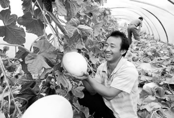 江西省龙南县近几年大力发展种植业,今年种植的甜瓜系列、无公害脐橙等喜获丰收。这是里仁镇栗园围村村民袁添福正在摘甜瓜。 本报记者 李景录摄