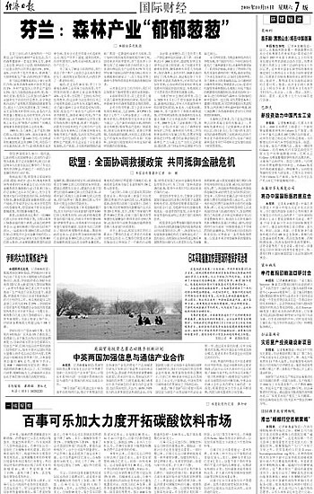 芬兰副总理兼财政部长卡泰宁向我们介绍,虽然其森林面积不到世界总量的1%,木材产量也仅占世界总产量的1.5%,但大力提倡造纸企业林、浆、纸一体化发展,使得芬兰以其强大的森林产业链和处于前沿的信息技术,在全球造纸自动化产业和技术领域扮演着重要角色。通过十几年的迅速发展,芬兰林纸工业无论在技术和管理方面,还是在产品和质量上都被公认为世界领先。在今天的信息社会里,作为芬兰支柱产业的林纸工业又以其“林纸产业群体”的模式影响着未来制浆造纸工业的发展。