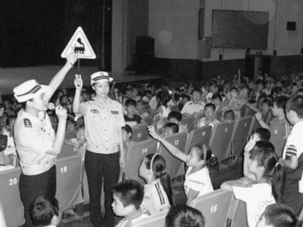 辽宁省本溪市平山交警大队女子中队每当寒暑假来临和开学之际,就为同学们讲解交通安全常识,义务宣传《道路交通安全法》。图为女子中队民警在为学生们上交通安全宣传课。 张丹萍摄影报道
