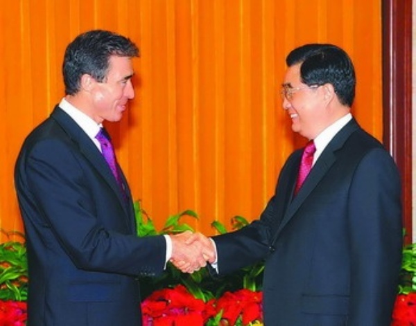 胡锦涛阐述了中国政府关于加强国际合作、共同应对国际金融危机的立场,拉斯穆森赞赏中方的积极立场,期待同中方加强合作。