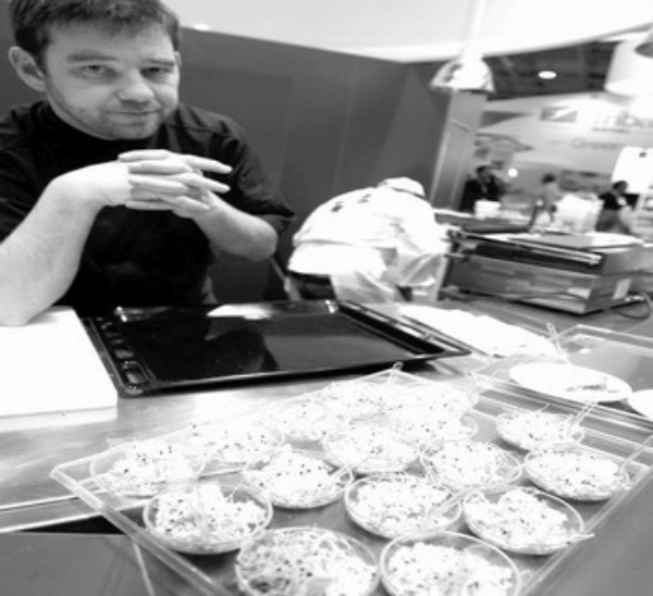 为期5天的2008年巴黎国际食品展19日在巴黎北郊的维勒潘特展览馆开幕。本届展会展区面积达到21.5万平方米,吸引了5500个世界各地的参展商,预计将接待参观者14.5万人次。图为一名厨师在展示用山羊奶酪制作的美食。 新华社记者 张玉薇摄