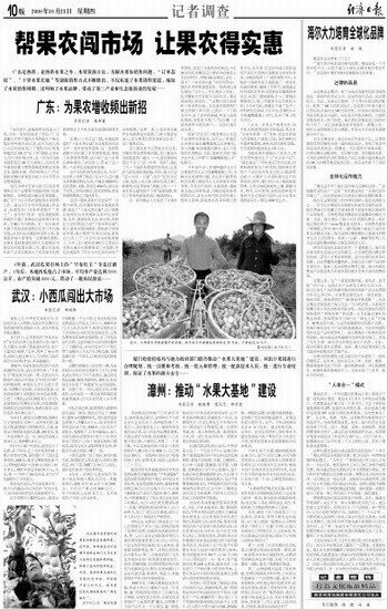 广东是热带、亚热带水果之乡,水果资源丰富,为解决果农销售问题,“订单荔枝”、“十里水果长廊”等创新销售方式不断推出,不仅拓宽了水果销售渠道,缩短了水果销售周期,还叫响了水果品牌,带动了第三产业和生态旅游业的发展———