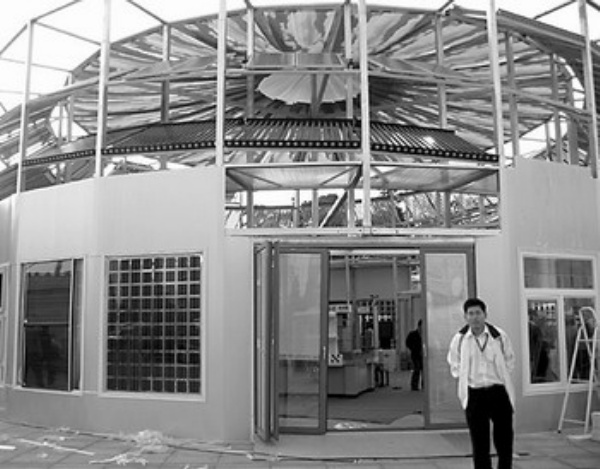 双螺旋太阳能技术展示厅是多项太阳能利用技术的集成展示。其主体搭建为钢结构建筑,其上半部形成两个螺旋体,分别为太阳能电池板和太阳能光热集热管组成。主体搭建采用了14个企业的不同的太阳能利用及节能环保技术,为太阳能技术与建筑一体化进行了大胆的实践与有益地探索。