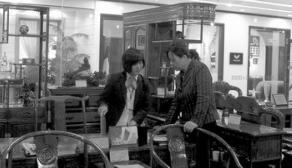 在北京某大型家具城,销售人员正在向顾客介绍一套红木家具。由于出口受到影响,越来越多的家具生产企业开始深耕国内市场。 本报记者 乔金亮摄