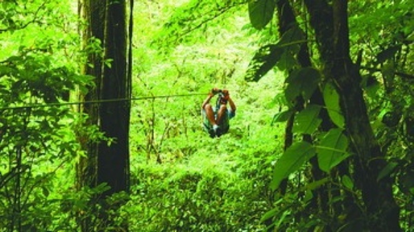 哥斯达黎加是全球生态多样性保存最为完好的国家之一。近年来,哥政府依靠这一优势大力发展生态旅游,开发了诸如雨林滑翔、雨林漫步、火山温泉游等一系列性价比相当高的生态旅游项目,吸引了一批欧美游客。目前,哥斯达黎加的旅游业收入已超过传统的咖啡生产业,成为哥国的一大重要经济支柱产业。图为在哥斯达黎加中部山区圣洛伦索,一名游客正在体验刺激的雨林滑翔运动。新华社发