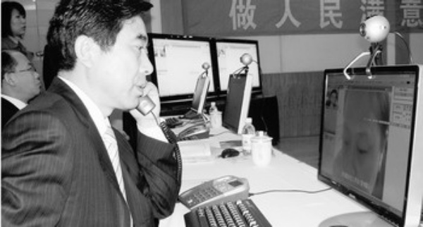 “市北民情在线”视频网络政务平台近日在青岛市市北区开通。该平台通过在全区各部门、各街道和各社区居委会建立的169个视频网络终端,架起了居民与区直各部门和街道办事处的视频沟通桥梁。市北民情在线提供了100多个与百姓工作、学习、生活相关的服务项目,并制定了严格的工作规范、管理模式、定期反馈、解答限期以及领导接待等各项制度,以真正做到方便快捷地服务民众。图为青岛市市北区委书记王建祥正在与居民视频连线,耐心解答问题。 本报记者 刘 成摄