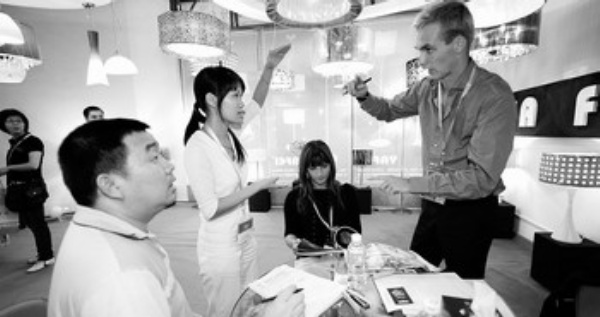10月18日,两名来自欧洲的客商在亚非灯饰展厅里洽谈业务。 当日,为期6天的第七届中国古镇灯饰博览会在广东中山市古镇开幕。被誉为“中国灯饰之都”的古镇是全国最大的灯饰研发、生产、销售集散地。 新华社记者 周文杰摄