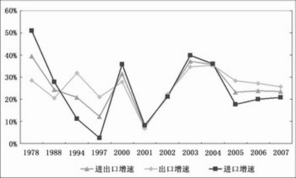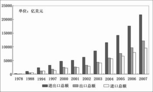 2007年我国进出口贸易总额从1978年的206亿美元猛增到21737亿美元,增长了104倍。其中,出口总额从98亿美元增加到12178亿美元,增长了124倍;进口总额从109亿美元增加到9560亿美元,增长了87倍。1979年—2007年进出口贸易年均增长17.4%,其中出口年均增长18.1%,进口年均增长16.7%。
