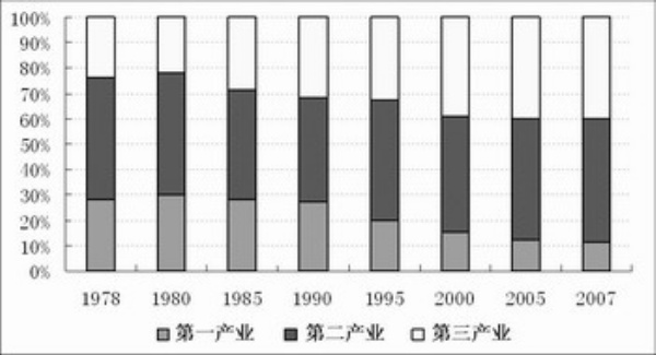 1979年—2007年第一产业年均增长4.6%,第二产业增长11.4%,第三产业增长10.8%。第一产业所占比重从1978年的28.2%下降到2007年的11.3%,第二产业所占比重由47.9%上升为48.6%,第三产业所占比重由23.9%上升为40.1%。现代经济的结构性特征越来越明显。