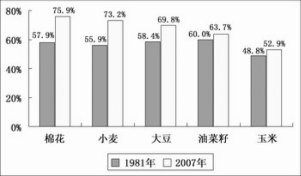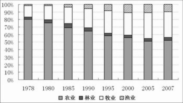 农业总产值中,种植业比重明显下降,林、牧、渔业比重显著提高。种植业由1978年的80%下降为2007年的50.4%。林、牧、渔业所占比重分别由1978年的3.4%、15%和1.6%变为2007年的3.8%、33.0%和9.1%。种植业内部结构调整进展明显。在粮食生产稳定发展的情况下,棉、油、糖、果、蔬菜等经济作物生产获得大发展。