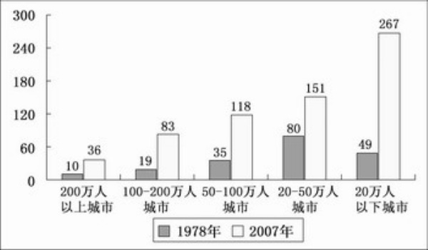 城镇化水平持续提高。30年来,我国城市数量持续增长,城市体系和功能不断完善。1978年至2007年,城市数量由193个发展到655个。其中,市辖区人口200万人以上的城市由10个增加至36个;100万至200万人的城市由19个增加至83个;50万至100万人的城市由35个增加至118个。大量的乡村人口由农村向城市转移,城镇总人口增长了2.44倍,乡村总人口减少了7.9%。城镇人口占总人口比重由1978年的17.92%上升到2007年的44.94%,提高了27.02个百分点,年平均提高0.9个百分点。