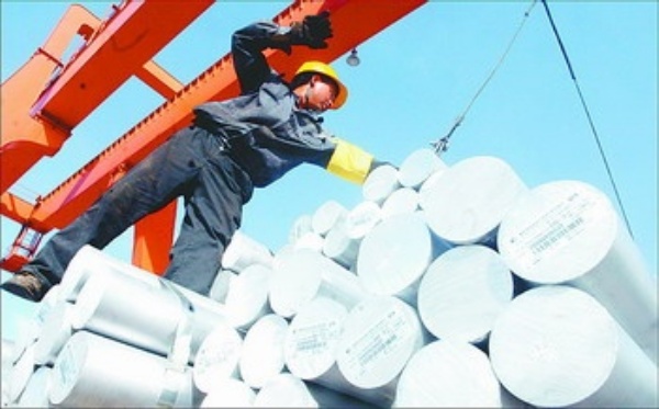 青铜峡铝业集团货场,工人正在吊装装车。该集团是我国第二大铝生产基地,目前已形成年产43万吨电解铝和28万吨阳极炭块的生产能力,技术水平、产能及环保措施等均位居全国同行业前列。