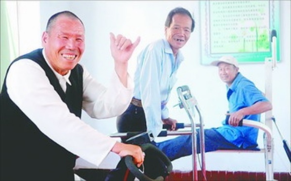 谭桥镇谭桥村农民健身房,村民杨连山(左)在讲述村里新农村建设的成果。随着农民收入的不断提高,村民对生活质量的要求也越来越高,新建的健身房和康复中心特别受欢迎。