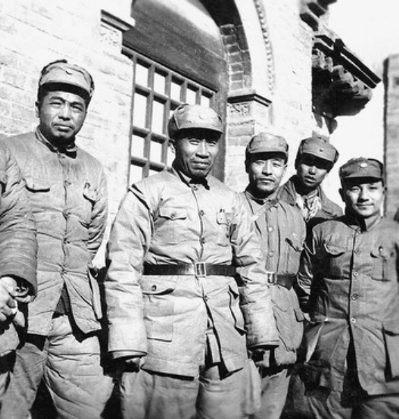图②:1938年,朱德、彭德怀、邓小平、萧克(右二)、彭雪枫等在山西洪洞县马牧村八路军总部。