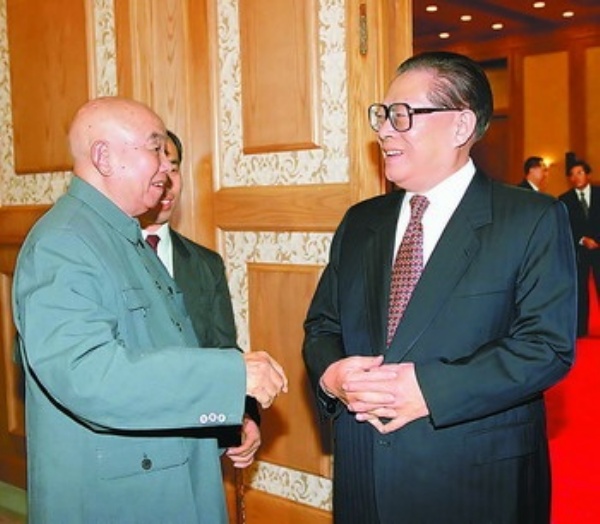图③:1998年11月9日,江泽民在北京人民大会堂与萧克亲切交谈。