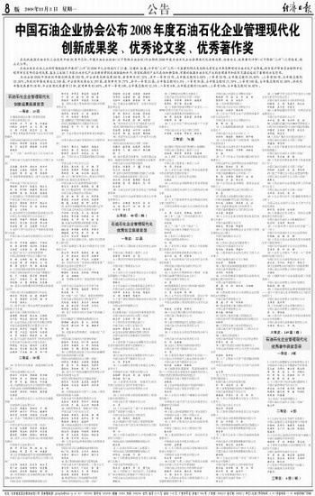 在庆祝我国石油石化工业改革开放30周年之际,中国石油企业协会(以下简称石油企协)行业部级2008年度石油石化企业管理现代化创新成果、优秀论文、优秀著作评审(以下简称“三评”)工作结束,现正式公布。