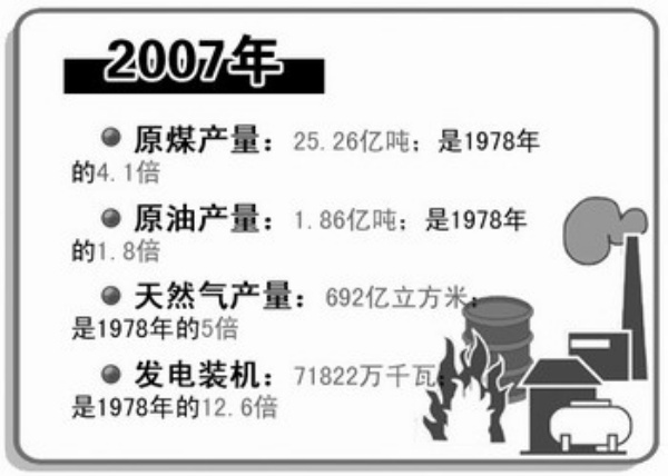 2007年,原煤产量达到25.26亿吨,是1978年的4.1倍。原油产量1.86亿吨,是1978年的1.8倍。天然气产量692亿立方米,是1978年的5倍,起步于20世纪50年代的海洋石油工业,随着1982年中国海洋石油总公司的成立获得了高速发展,海洋油气产量从1982年的9万吨迅速升至2007年的4047万吨油当量。到2007年底,发电装机达71822万千瓦,是1978年的12.6倍。其中火电55607万千瓦,水电14823万千瓦,分别是1978年的14倍和8.6倍;核电从无到有,到2007年,已形成885万千瓦的发电装机容量;风力发电迎来发展高峰,2007年装机容量为420万千瓦。