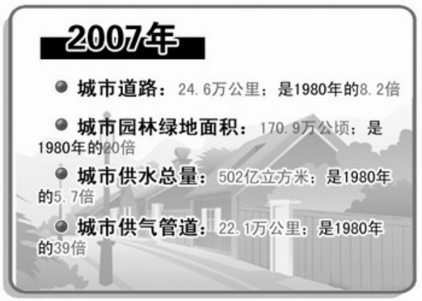 30年来,我国供水供气、污水处理等基础设施发生了翻天覆地的变化,保障能力大幅度增强。2007年,城市供水总量502亿立方米,是1980年的5.7倍,用水普及率达到93.8%,比1980年提高12.4个百分点;城市供气管道长度22.1万公里,是1980年的39倍,用气普及率达到87.4%,而1980年仅为16.8%。2007年,我国城市污水日处理能力已达10337万立方米,是1996年的9倍。