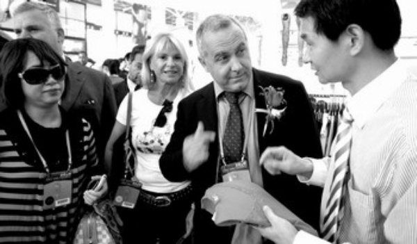10月21日,中国义乌浪莎企业的营销人员正在向意大利商人推荐新产品。