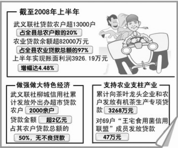 柳城镇农民俞学文,就是在武义联社的扶持下,承包了海拔800多米的小和尚山上的有机茶园,创建了更香公司第一块有机茶生产基地。经过几年努力,更香公司现已拥有6万余亩有机茶园,年销售茶叶180万斤,年销售额可达2.3亿元,其产品出口美国、韩国、日本及欧盟等地,并带动10万农民脱贫致富。据了解,该社已向更香公司累计发放贷款700万元,给中国有机茶第一名牌的发展提供了强大的推动力。与此同时,该社在支持当地茶叶龙头企业发展的同时,还向许多从事有机茶生产的农户提供资金支持。农户在承包、采摘及加工等一系列环节急需资金时,都可以向该社申请贷款。